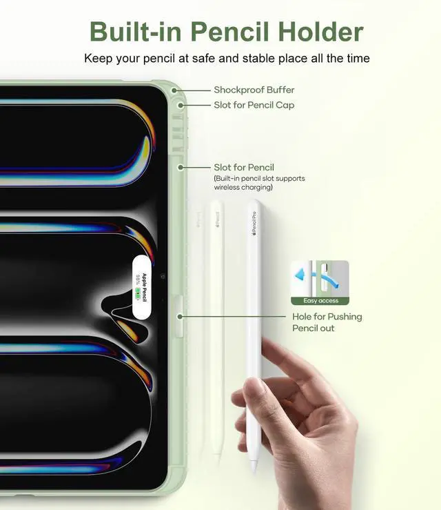 Convenient Pencil Holder: This case with stand has a pencil holder for Apple Pencil users. No more worry about losing or having no place for the pencil. The holder provides dedicated storage, keeping the pencil always ready. It fully supports magnetic attachment and wireless charging between Pencil Pro