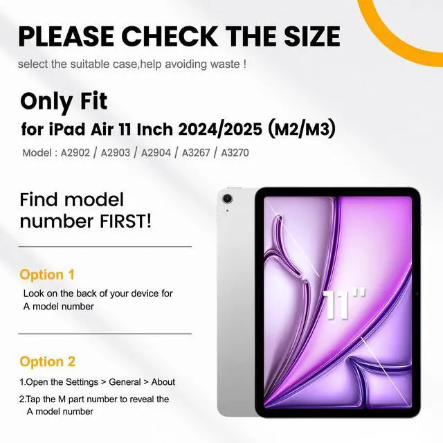 [Compatibility]: Exclusively designed Shockproof Rugged Case for iPad Air 11 Inch 2024 Release 6th Generation(Model:A2902 / A2903 / A2904) / iPad Air 11 Inch 2025 Release(Model:A3267 / A3270). Not compatible with any other devices. Please check the back bottom of your tablet to find the model number