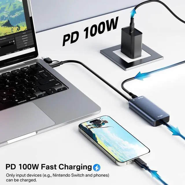 PD 100W Fast ChargingYou can play and charge simultaneously without worrying about the Nintendo Switch or Steam Deck running out of power while playing games. Note: When connecting the Switch, an external power supply is required (voltage above 15V). This device does not support bidirectional charging.