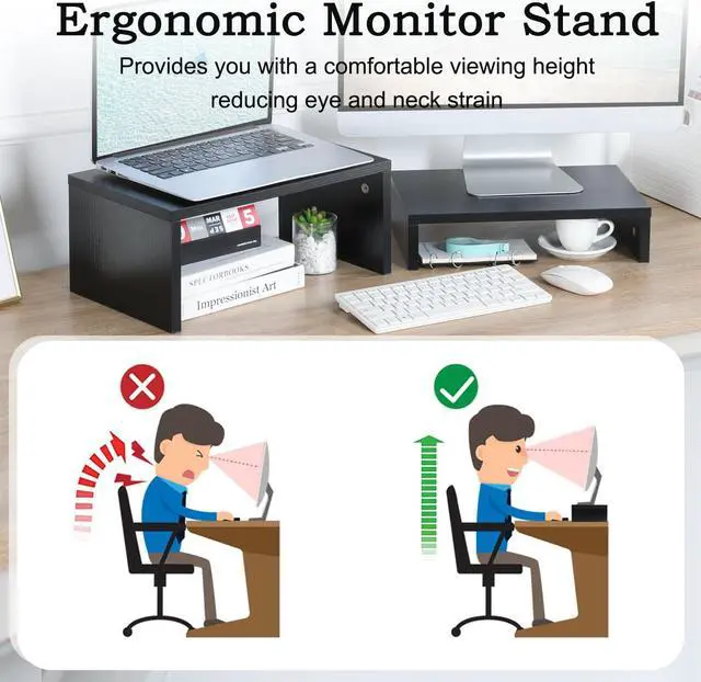 TEAMIX 2 Pack Black Monitor Stand Riser, Wood 2 Tier Adjustable Stand for 2 Monitors/Laptop/PC