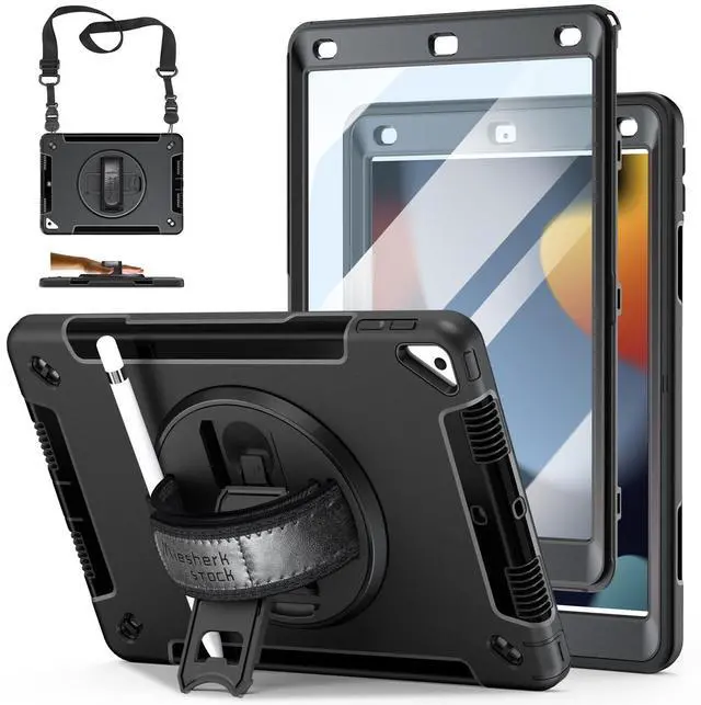 Case for iPad 9th/8th/7th Generation 10.2 Inch: TPU Cover for iPad 10.2 Inch with Screen Protector - Stand - Handle - Shoulder Strap- Pencil Holder- Black