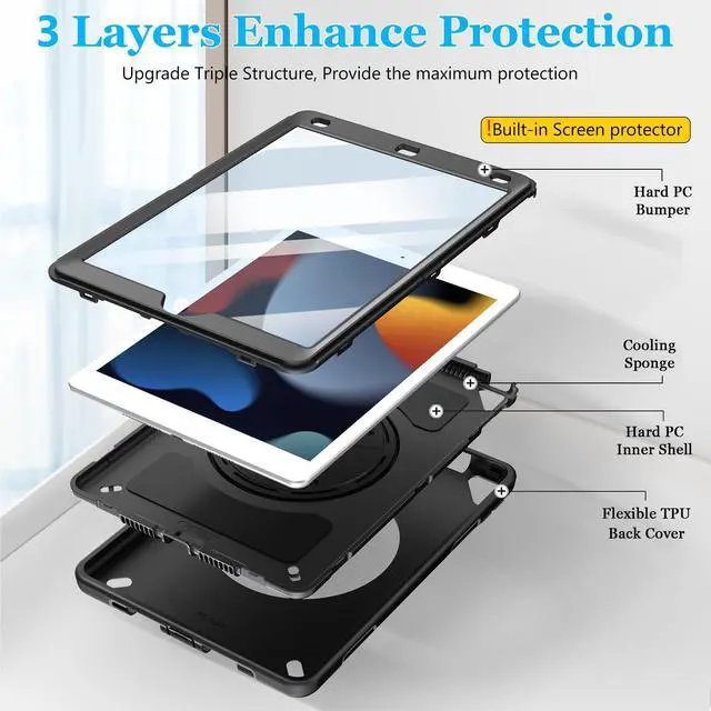 MATERIAL COMPOSITION: This Case for iPad 10.2 case has a built-in screen protectorit can be removed). The inner cover are Made from Hard PC and outer layer is silicone. It feels very comfortable. Our triple defense system has passed the Military Grade Drop Test [MIL-STD 810G-516.6] and can withstand shocks and drops from up to 15 feet, 10,000 times. These shock-absorbent layers incorporate Air Cushion Technology to effectively protect your iPad from accidental drops, bumps, and scratches