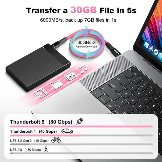 Ultra High Speed Transmission : The HYairspy Thunderbolt 5 data cable is compatible with Thunderbolt 5/4/3, USB4, and USB-C protocols, with a transfer rate of up to 80Gb/s, meeting the requirement of transferring large files in seconds. It also supports high-definition expansion capability, supports 16K/30Hz,8K/120Hz/60Hz,4K/240Hz/120Hz/60Hz resolution video output (device compatibility required), and easily connects to multi screen displays, docking stations, and other peripherals. ^