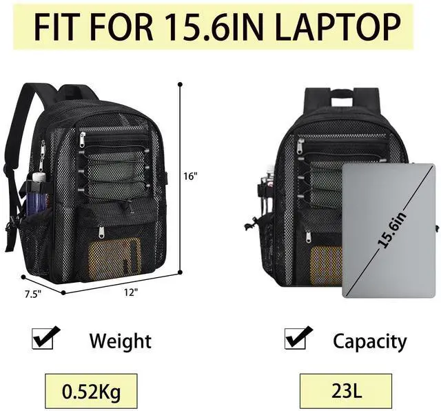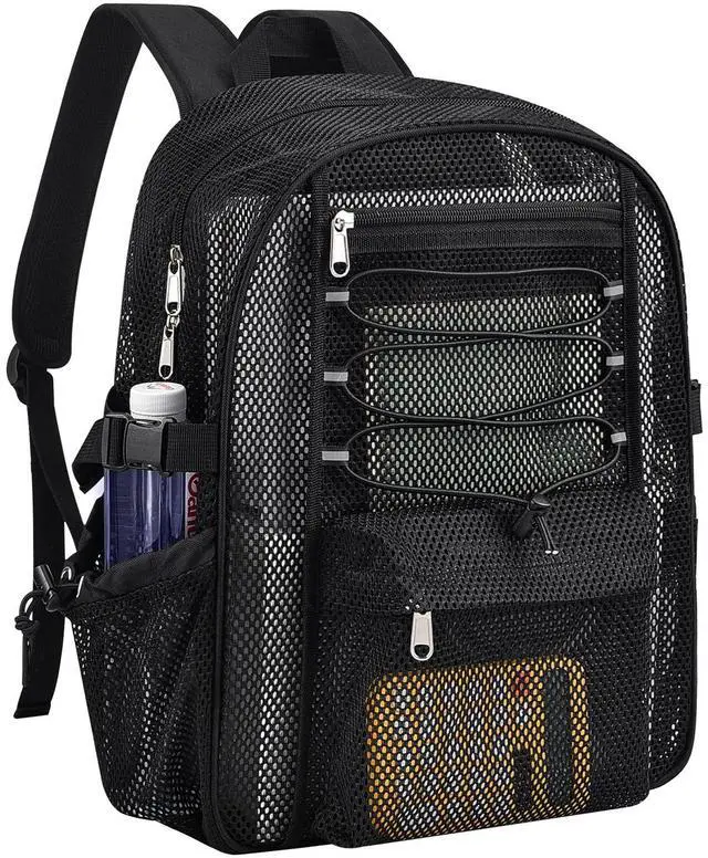 UEASE Mesh Backpack Heavy Duty for School, 23L Mesh Bookbag for Adults, See Through Black Mesh School Bag with Laptop Pocket for Work Swimming Beach Fitness Sport