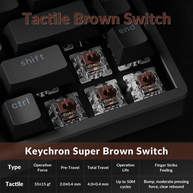 Keychron Super Red Switch: This linear switch delivers a smooth, quiet typing experience with no tactile bump, perfect for fast typists and office environments.