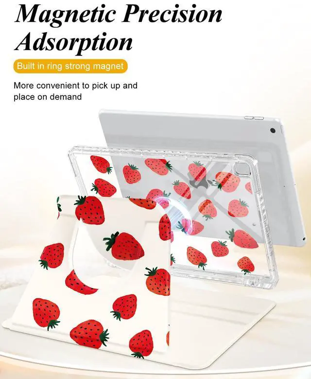 Shorogyt for iPad 9th/8th/7th Generation 10.2 Inch Case Magnetic Stand for Women - Cute Design 360 Degree Rotating Covers Girls with Pencil Holder for Apple i Pad 9/8/7 Gen,Red Strawberry
