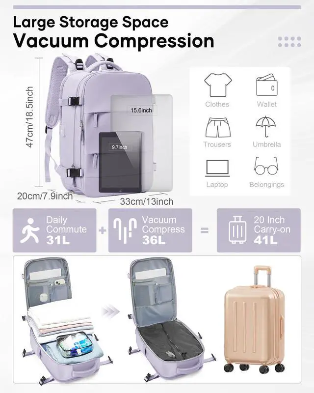 Airline Approved: Vacuum travel backpack size: 47×33×20 cm / 18.5×13×7.9 inches. This carry-on backpack meets the standard requirements of almost all major airlines and can be placed in overhead compartments and under seats. The travel laptop backpack can be unfolded 90-180 degrees, allowing you to quickly pass through airport security and keep your belongings neat and organized.