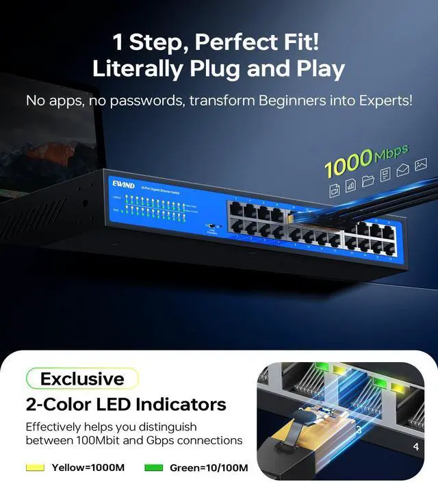Plug & Play with Dual-Color LEDsThis gigabit switch have instant network expansion with 24 auto-sensing 10/100/1000Mbps ports. This ethernet switch supports Auto MDI/MDIX and IEEE 802.3az energy-efficient standards. No configuration neededjust plug in for instant gigabit networking. Also, the 24 port network switch have exclusive dual-color LED design lets you quickly distinguish 100Mbps/Gbps port statuseseven beginners can manage like pros.