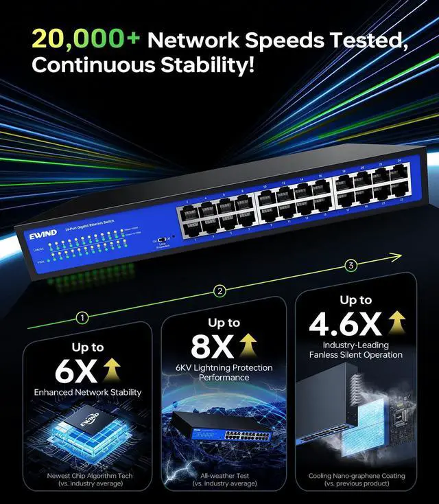 Trustworthy Gigabit High-Speed SwitchInstantly upgrade to 1Gbps without Cat6 wiringcuts installation costs & hassle by 60%! Featuring a military-grade chipset and double-shielded anti-interference circuitry, this network switch has undergone 50+ rigorous engineering testsincluding 8,000+ hours of full-load stress testing and 4,000+ RJ45 port plug/unplug cycles, etc. Its stability, durability, and safety perform NO.1 among all switch, maintaining like-new performance for 7+ years.