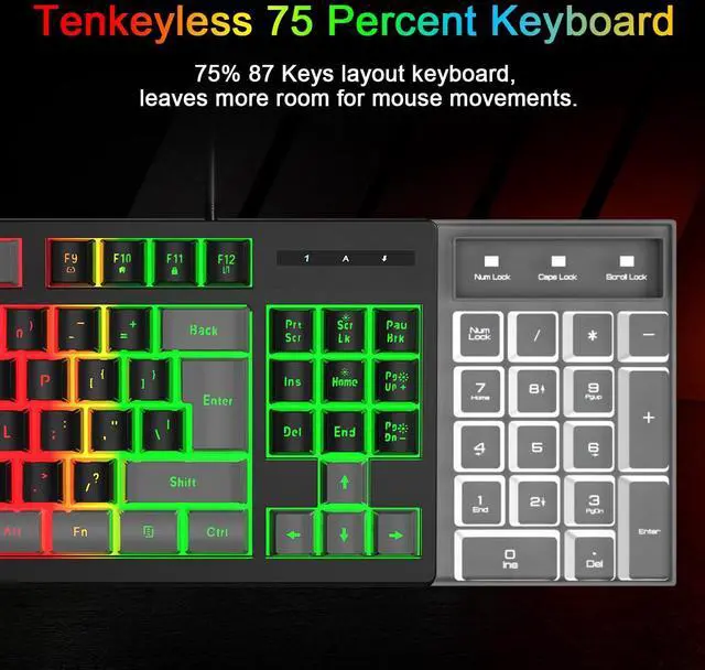 75% TKL Keyboard : Compact 87 Keys Tenkeyless keyboard, no additional number keys, free up workspace on your desk, allows for better mouse movement. 12 multimedia keys to facilitate your gaming operation or work efficiency, 19 Non-conflict keys allows you to press or hold multiple keys simultaneously without fear of missing or unexpected key presses.