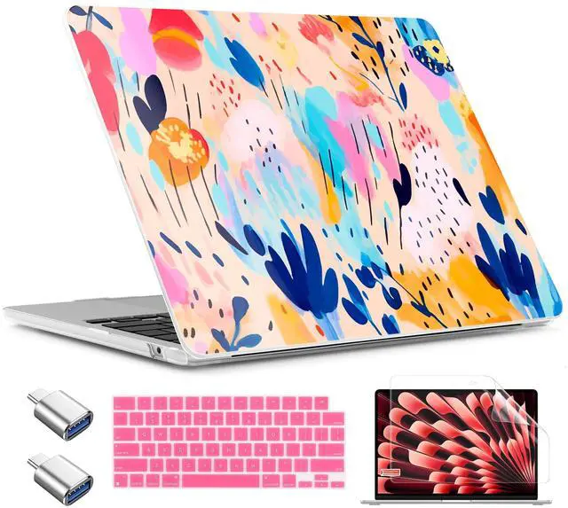 TWOLSKOO Compatible with M4 MacBook Air 13.6 inch Case 2025-2022 Release M4 A3240 M3 A3113 M2 A2681, Plastic Hard Shell & Keyboard Cover & Type C Adapter & Screen Protector, Bright Abstract Florals