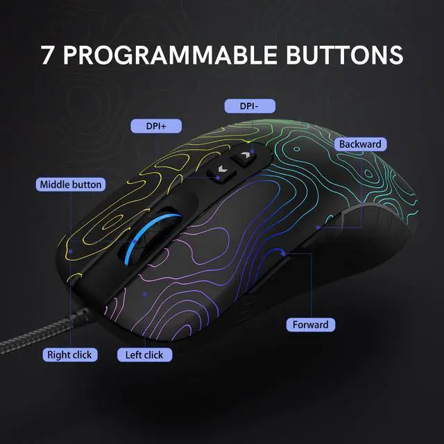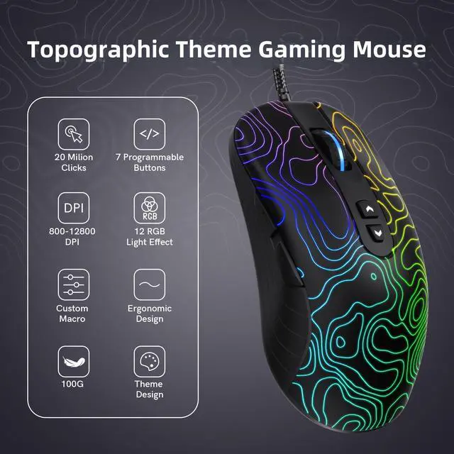 dagaladoo Black Wired Gaming Mouse, 12800 DPI RGB Gaming Mouse with 7 Lighting Effects, PC Gaming Mice Support DIY Keybinding, Mouse Gamer Computer Mouse for Laptop PC Mac Windows,Topographic
