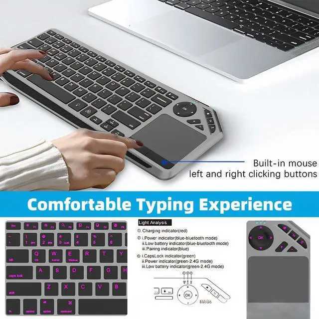 Touch Remote and Vibrant Lighting: Wireless Keyboard with Trackpad supports multi gesture touch control, built in mouse left and right press keys, can be combined with remote control applications, more flexible and convenient. It also comes with seven color backlighting and three levels of adjustable brightness.