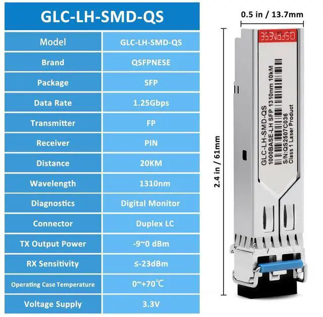 QSFPNESE 1.25G SFP 1000BASE-LX Transceiver, 1310nm SMF Module, up to 10KM/20KM, Compatible with Cisco GLC-LH-SMD, Meraki, D-Link, Supermicro, Fortinet, Ubiquiti, Netgear, Mikrotik, 10pack