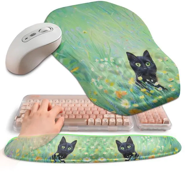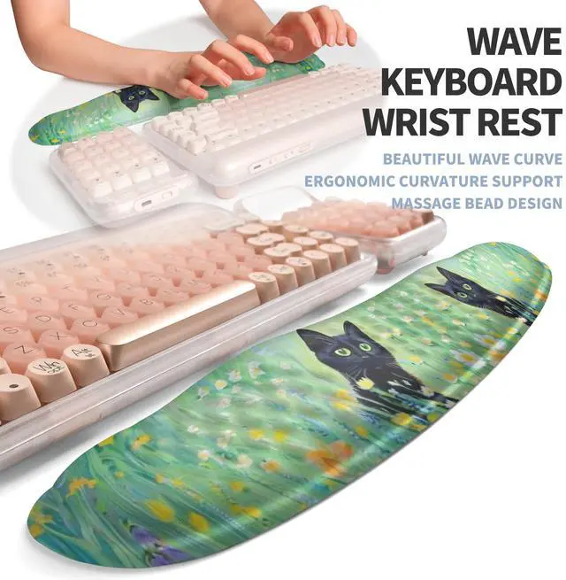 Gleamtide 2-in-1 Ergonomic Set, Wave Keyboard Wrist Rest and Massage Slope Mouse Pad Wrist Support, Rebound Memory Foam for Relieve Carpal Tunnel Syndrome and Wrist Pain (Oil Painting Cats)