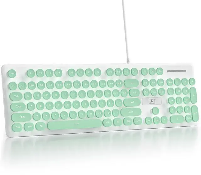 Fogruaden Wired Computer Keyboard, Quiet Full Size Membrane Keyboard, Retro Typewriter Style Round Key, Light Up, Green Cute Keyboards, White LED Backlit, Slim, Silent for Windows PC, Laptop