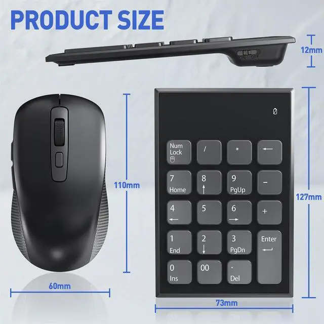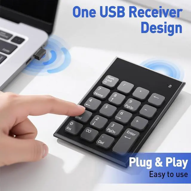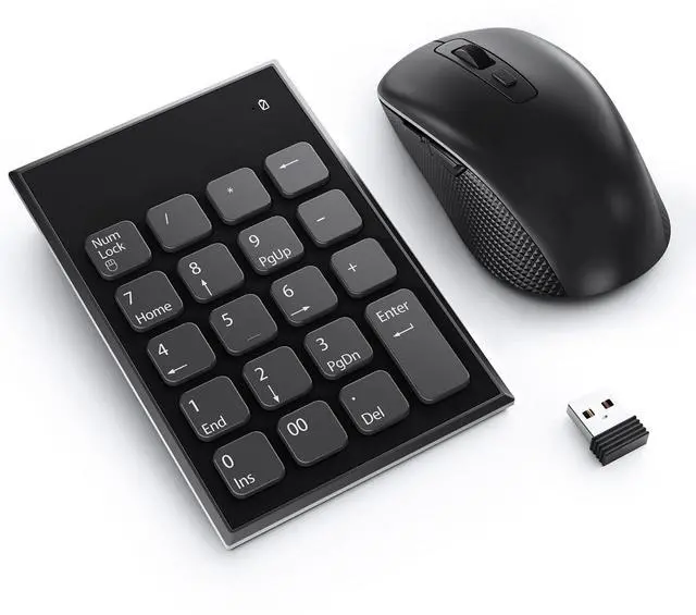 The wireless number pad and mouse combo features advanced 2.4GHz wireless technology for instant plug-and-play setupno software installation required. Both the 19-key numeric pad and mouse share a single USB receiver, saving your laptop/PCs USB ports. Note: The USB receiver is stored inside the mouse battery compartment for easy access and portability.