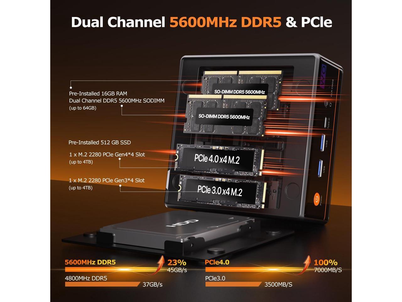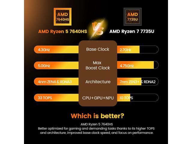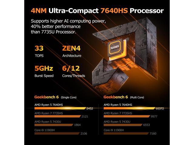 - Ultra-Compact 7640HS Processor With ZEN 4 architecture and TSMCs 4nm FinFET, the 7640HS mini PC reduces power consumption by over 62% in heavy gaming compared to 6nm processors, offering longer-lasting time. It boosts data throughput and AI performance by 60% over the 7735U and 80% over the 7430U. Featuring a 45W TDP, double L2/L3 cache, and 5GHz boost, it matches i5-13400F+RTX 3050 desktop PC, supporting 60FPS video processing, 22FPS AI rendering, and smooth 1080p 3A gaming.