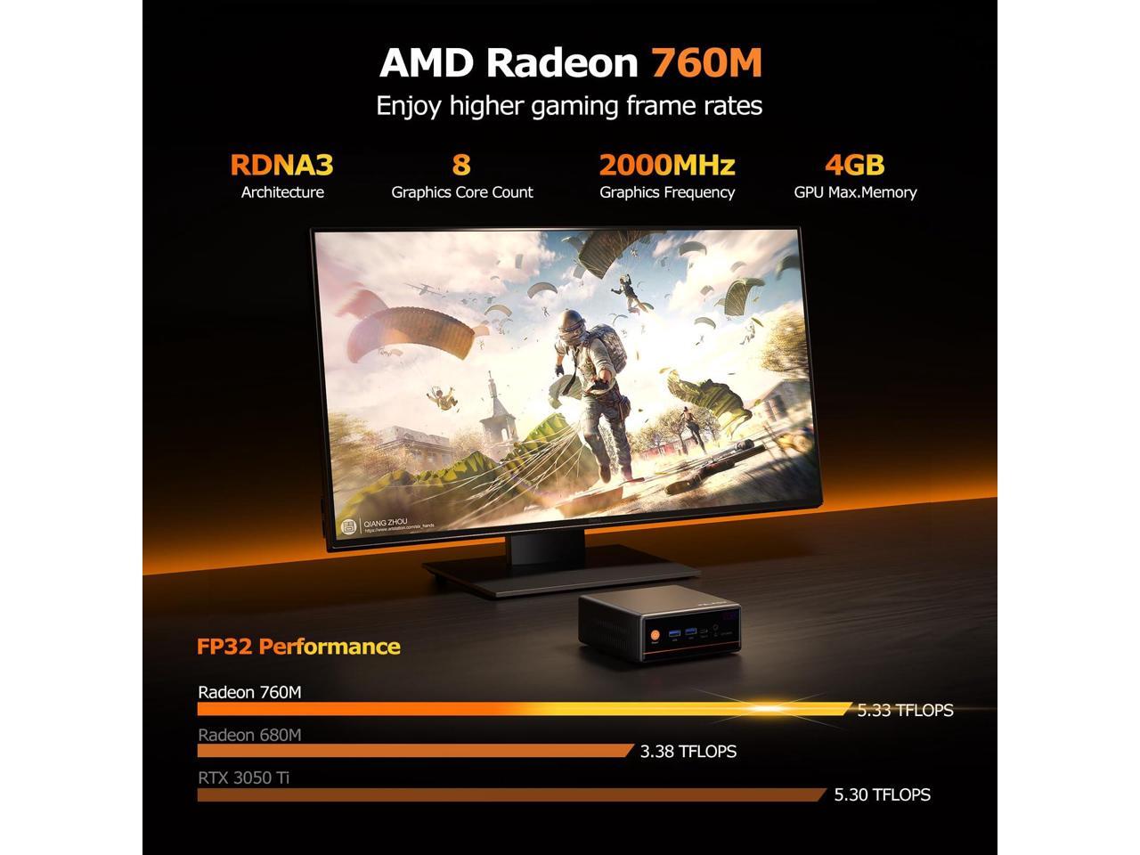 - 4GB Large-Capacity VRAM BIOS allows you to adjust graphics memory capacity up to 4GB on this mini gaming PC, supporting graphics-intensive tasks like AI acceleration, 4K video editing, 3D modeling, and CAD design. Equipped with 12CU RDNA3 Radeon 760M, it offers 2.3x the performance of the Zen 3+ Radeon 680M, with over 30% better multitasking and computational performance, 29% higher single-core, 45% better multi-core, and 35% faster gaming frame rates at 1080p high quality.