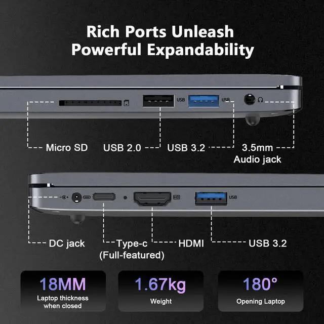 Full Range of Ports: This laptop is equipped with a wide range of ports. With 1 x USB 2.0, 2 x USB 3.2 ports, 1 x Type_C (fully functional), 1 x H
