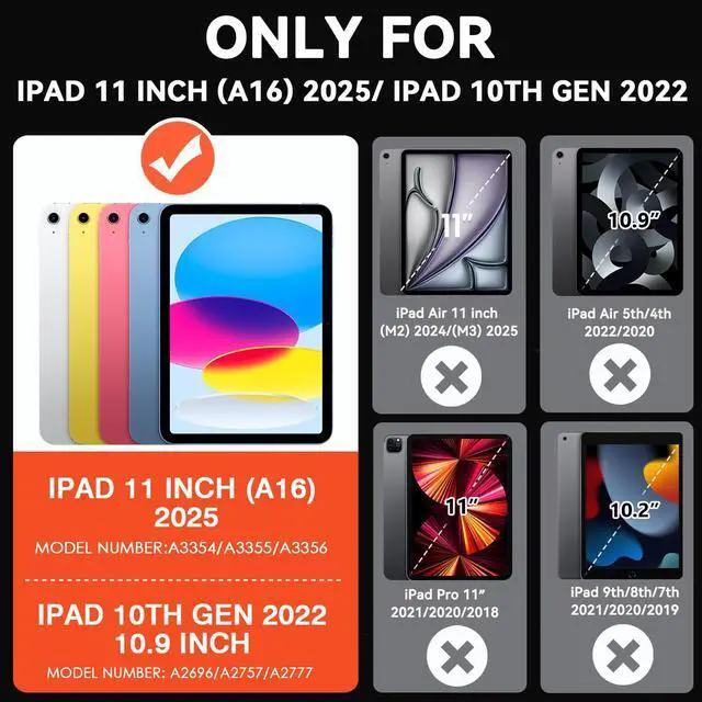 Compatible Models: Cantis case compatible with new iPad 11-inch (A16) 2025 (iPad 11th generation) & iPad 10th generation 10.9 inch 2022. Model Number: A3355/A3356/A2696/A2757/A2777. NOTE: This case WITHOUT built-in screen protector & NOT include pencil.