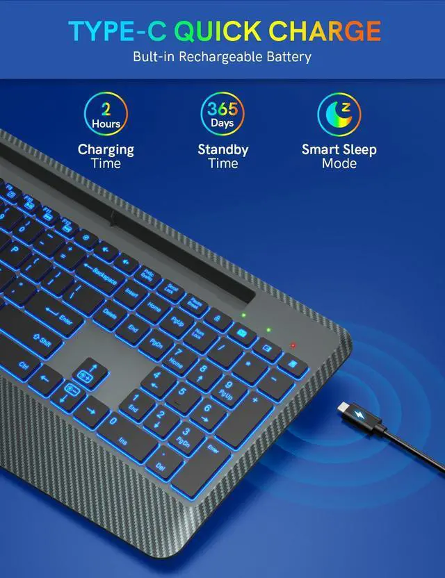 RECHARGEABLE AND LONG LASTINGThe rechargeable wireless keyboard is equipped with Type-C charging cable, This ergo keyboard has automatic sleep power saving mode and a separate ON/OFF switch. You can also adjust the light brightness at any time or turn off the light to save power.