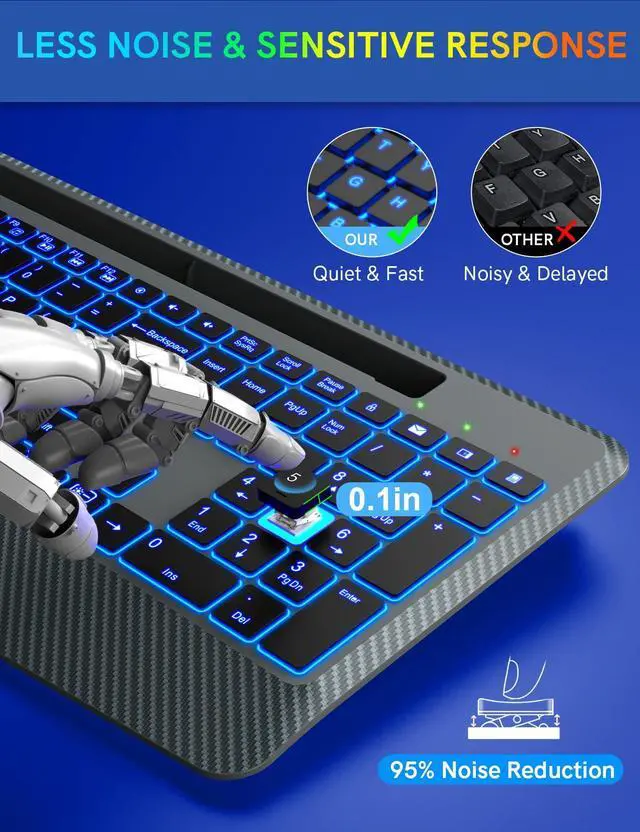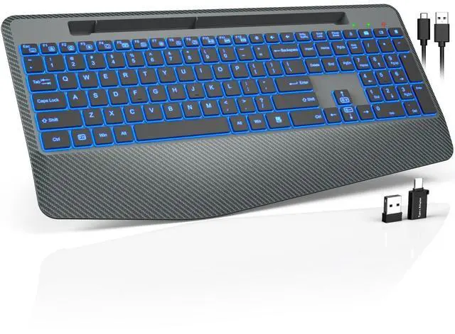 7 SWITCHABLE COLORS BACKLIGHT The ergonomic wireless keyboard comes with 7 switchable backlights and 3 brightness levels to provide you with a different visual typing atmosphere. Choose your favorite keyboard setting and take your desk setup to the next level. The keys will be clearer under the backlight, too. Let you work effortlessly in the dark typing.