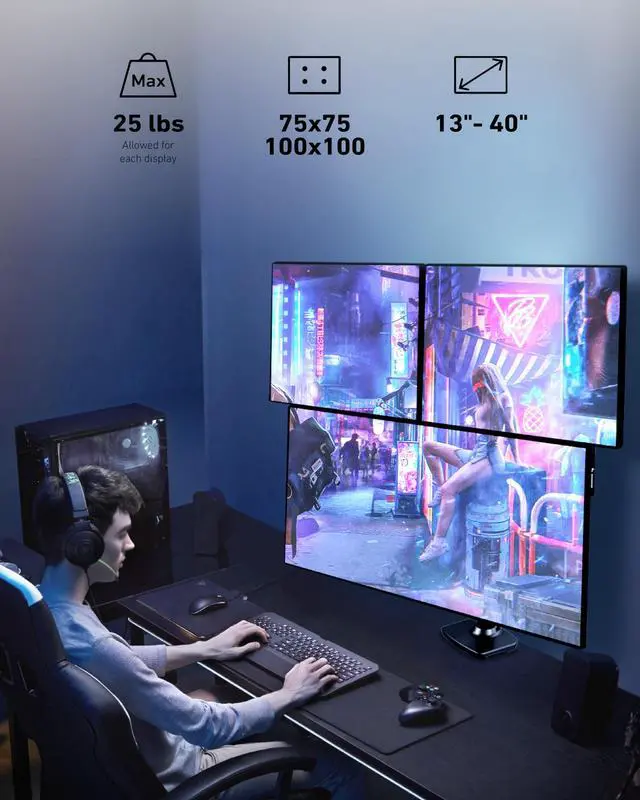Universal Monitor Compatibility This monitor mount for 3 monitors can fit most flat/curved screens up to 40 inches and 25 lbs (11.3 kg). VESA compliance: 100 x 100 mm and 75 x 75 mm from various brands.