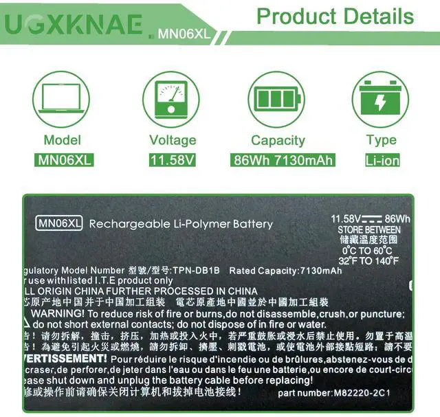 Specifications: Model Name: MN06XL standard Rechargeable Li-ion Battery; Battery Type: Lithium_ion; Voltage: 11.58 V; Capacity: 86 Wh 7130 mAh. Color: Black. Packages includes:1x MN06XL Laptop Battery, 2 x Screwdrivers for easy installation, 1x Instruction