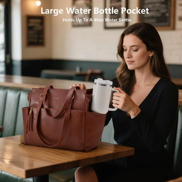 Womens laptop tote bag with a padded compartment for 15.6-inch laptops and iPads. Features multiple interior and exterior pockets, including slip pockets, two water bottle pockets, and zippered pockets, providing ample space for all-day essentials.