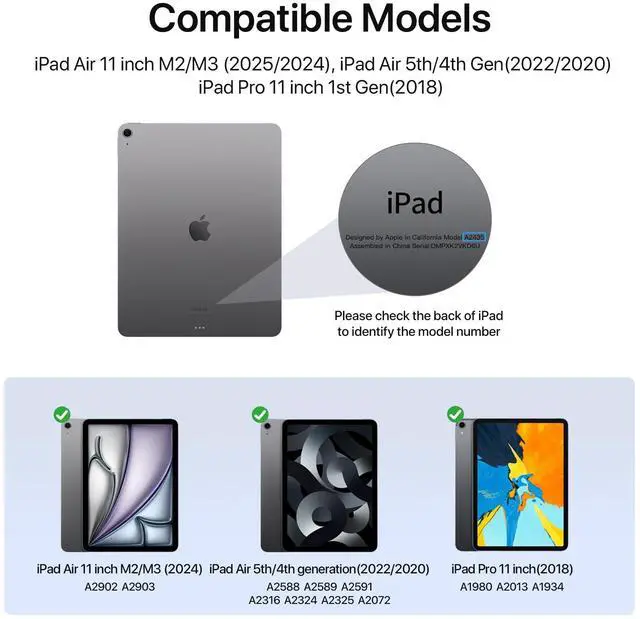 Compatibility: This iPad case is compatible with the iPad Air 11-inch M3/M2 2025/2024 (model numbers: A3266, A3267, A2902, A2903), iPad Air 5th/4th Generation 2022/2020 (model numbers: A2316, A2324, A2325, A2072, A2588, A2589, A2591), Please ensure your iPad fits with our folio case for optimal protection