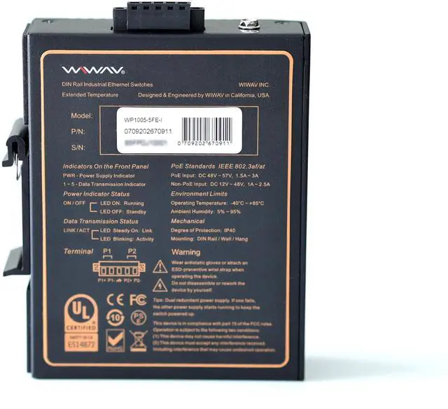 WIWAV WP1005-5FE-I 10/100Mbps Unmanaged 5-Port PoE Industrial Ethernet Switches with DIN Rail/Wall-Mount (UL Listed, IP40, -40~85)