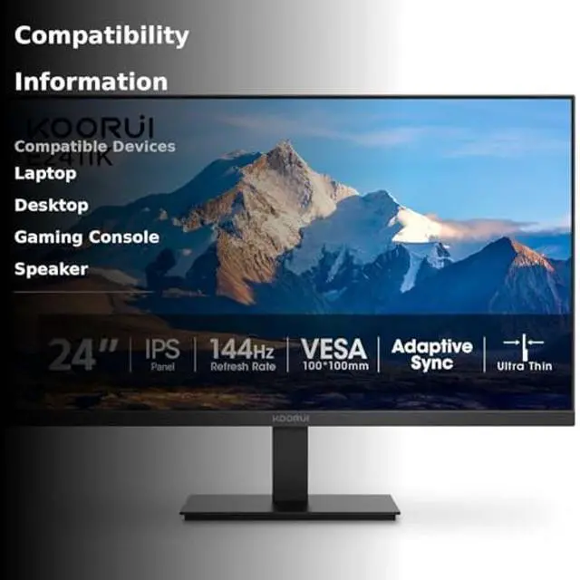 KOORUI 24 Inch Computer Gaming Monitor Full HD 1920 x 1080p 144Hz IPS Ultra-Slim Display with HDMI VGA, Adaptive Sync, 99% SRGB, VESA 100x100mm, Eye Care, Tilt, Black, E2411K
