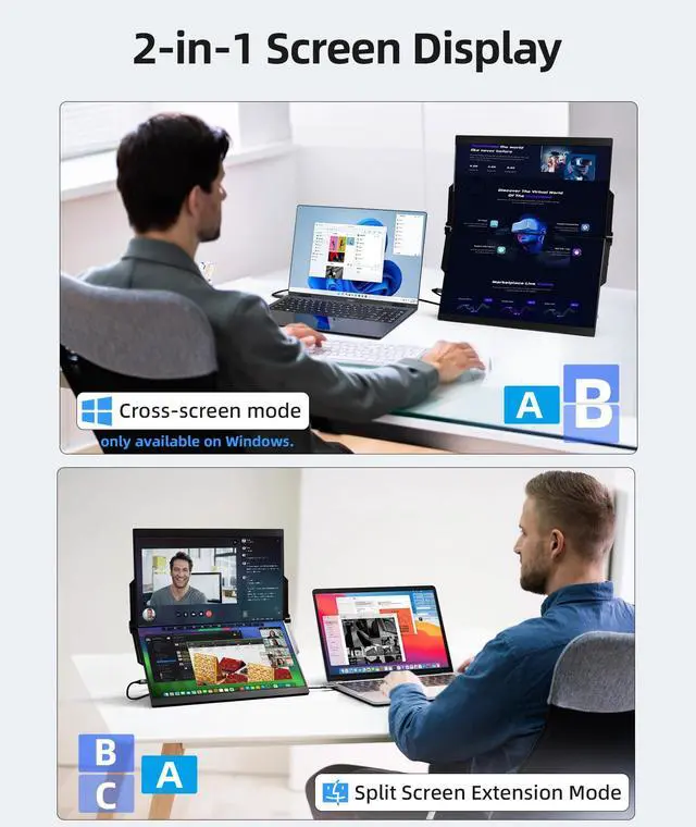 Flexible Connectivity for Effortless Setup: Seamlessly switch between cross-screen and split-screen modes, Ingnok Laptop Monitor compatible with both Windows and MacOS. Follow our comprehensive video guide for an eas