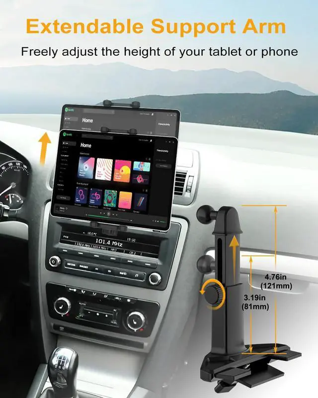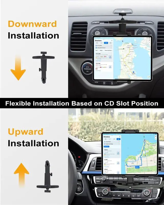 Adjustable Arm & 360° RotationThe car CD tablet holder has a retractable arm and 360-degree rotation, you can freely adjust the angle and height of your tablet or phone as needed.
