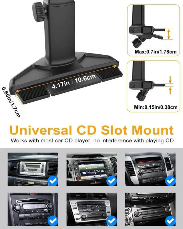 Compatible with Most CD SlotsThis CD tablet mount has an adjustable range of 0.15 to 0.7 inches (approximately 0.381.78 cm), making it suitable for most CD slots on the market with a width greater than 4.17 inches and a thickness over 0.15 inches. To ensure normal CD playback, insert a CD in advance before installing the mount.