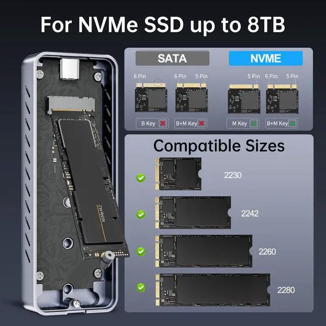 For NVMe SSD: M.2 enclosure accommodates M Key and B+M Key NVMe SSDs, supporting lengths 2230, 2242, 2260, and 2280 with capacity up to 8TB. Note: New drive may not be detected initially and need formatting before use. For cross-platform compatibility between Windows and macOS, we recommend formatting the drive as exFAT
