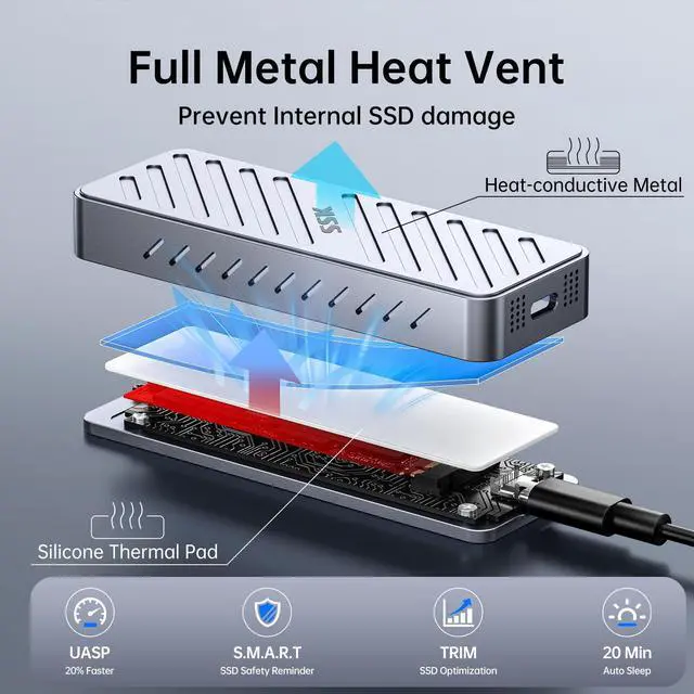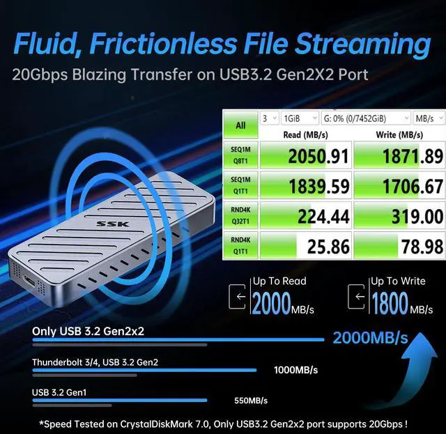 20Gbps: Blazing-fast data transfers read up to 2054MB/s, write up to 2070MB/s. 20Gbps USB-C and 10Gbps USB-A cables, ensuring versatile connectivity options. Unlock the potential of your M.2 SSD with our NVMe SSD enclosure