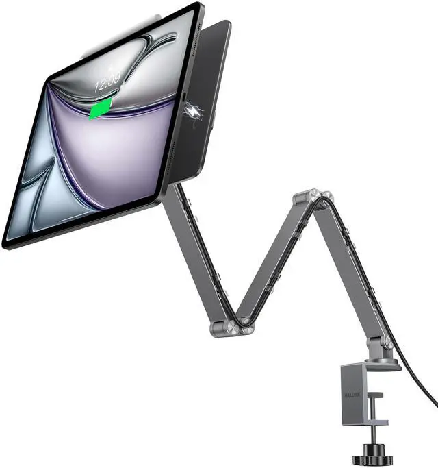 [Powerful Charging Magnetic iPad Stand] Upgraded ipad arm mount with powerful magnetism and providing up to 18W fast charging for efficient power delivery. This magnetic iPad stand for desk supports wireless charging via three Pin Smart Connectors integrated into the stand. And equipped with a USB-C charging cable, connect it to the stand and place your device on it to start charging