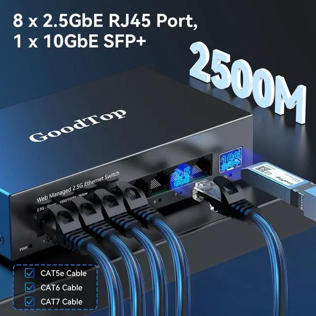 GoodTop 8 Port 2.5G Managed Ethernet Switch with 10G SFP, 8 x 2.5G Base-T Ports, Support LACP/VLAN/QOS/DHCP Client, Metal Web Managed Fanless Network Switch