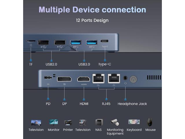 - Multiple Connections Equipped with 12 ports in total, including 4×USB (2xUSB 3.0, 2xUSB 2.0), HDMI/DP/Full-function Type-C (4K@60Hz, dual display support), 3.5mm audio jack, dual RJ45 Ethernet ports, TF card slot, plus WiFi 6 and Bluetooth 5.2. This small computer allows easy connection with monitors, projectors, TVs, and other off