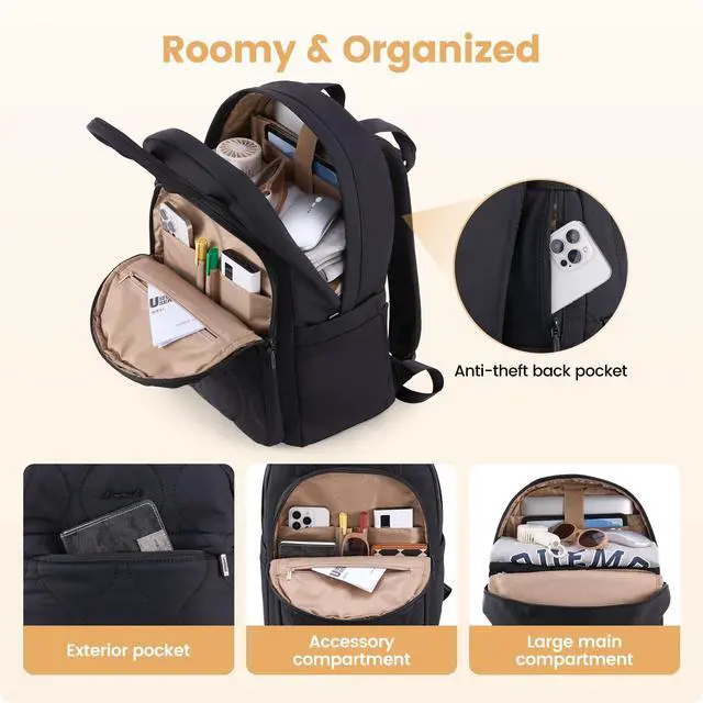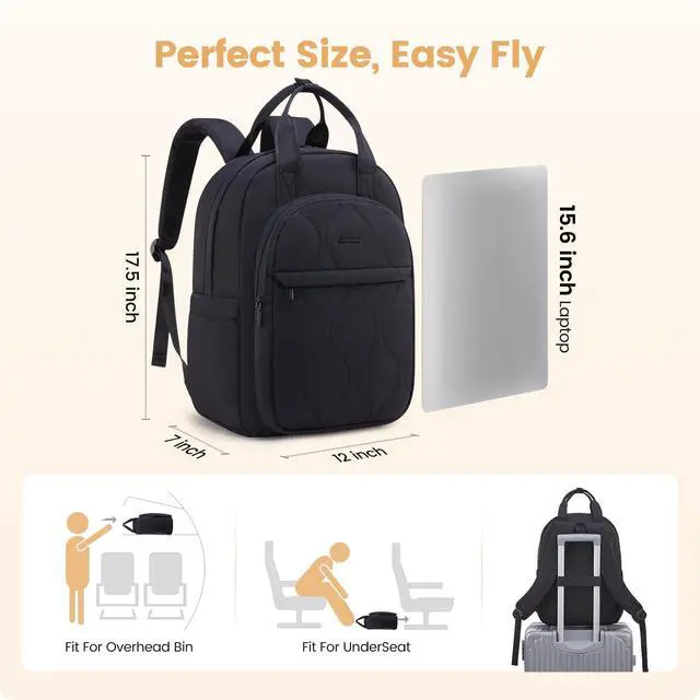 Large CapacityThe laptop backpack women has 3 right-sized compartments and more than 16 pockets,which makes it super easy to stay organizedlaptops,water bottles,extra clotheseverything has its own place,it is nice because that way stuff does not get mixed up or hard to find.Dimension:17.5''×7''×12''.
