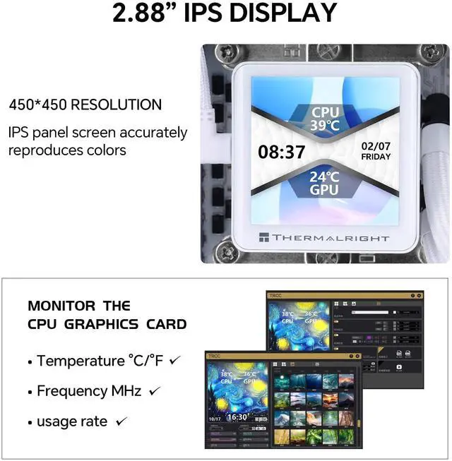 Magnetic Fixed And Customizable Lcd Display:FV360 ARGB V2 CPU Liquid cooler is equipped with a 2.88-inch IPS LCD screen with a resolution of 480x480 pixels, providing stunning visual effects and allowing users to freely monitor the display of various system parameters and DIY themes and other superb fun. (Note: The application needs to be downloaded from THERMALRIGHT Official Website)