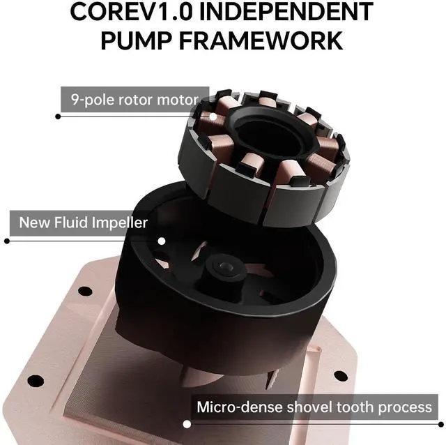 New Generation Pumps: Accumulated generations of solutions recast in a new framework for efficient heat transfer, with a powerful 9-pole rotor motor, a new fluid impeller, and speeds up to 3000 RPM, while remaining quieter than 23dB(A). The newly designed pump maximizes cooling capacity by pre-coating with a thermally conductive paste.
