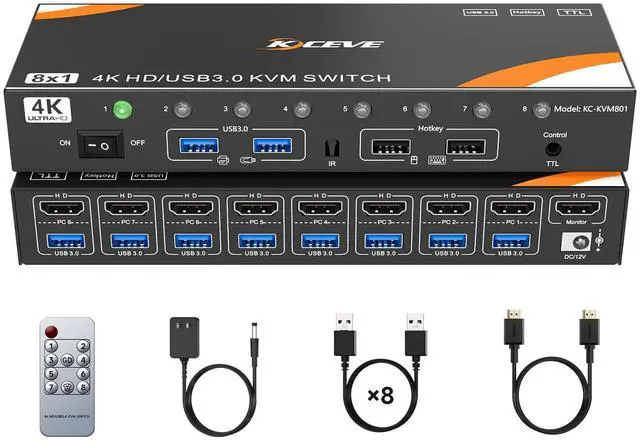 HDMI KVM Switch 8 Computers 1 Monitor, 8 Ports USB 3.0 KVM Switcher Support 4K@60Hz for 8 PC Share Keyboard and Mouse, Support Hotkey Switching Way