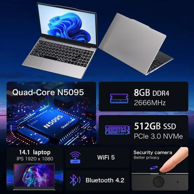 Processor4-Core CPU N5095 up to 2.9GHz for smooth multitasking, stable performance, and low power consumption. Perfect for students, freelancers, and professionals who need a reliable laptop for everyday tasks.