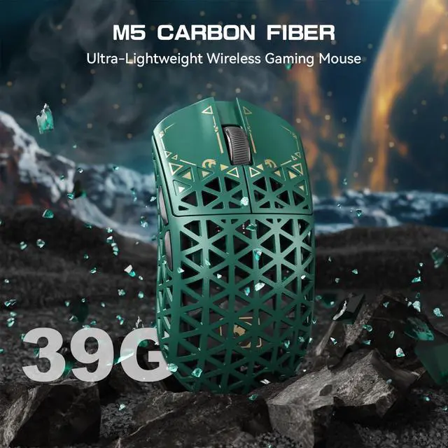 • Ultra-Lightweight Carbon Fiber BuildOnly 39g Crafted from real carbon fiber, the M5 Ultra combines extreme strength with ultra-light agilityjust 39 grams. The sleek carbon texture and anti-slip coating offer superior grip and long-lasting durability. Perfect for competitive gamers seeking speed and precision with no compromise.