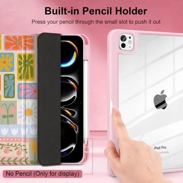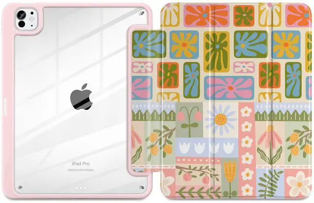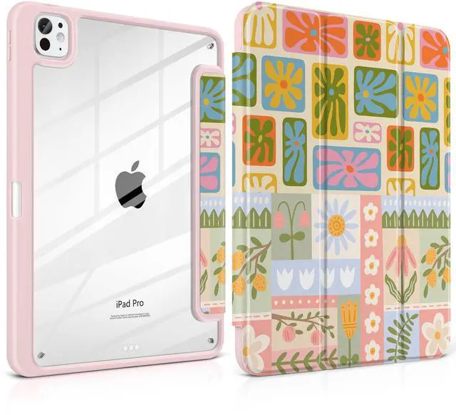 Loyrina Case for iPad Pro 13 inch (M5) 2025 (M4) 2024 Release Slim Lightweight Cute Light Pink Cover with Clear Back TPU Edge Pencil Holder Trifold Stand, Flower Patchwork