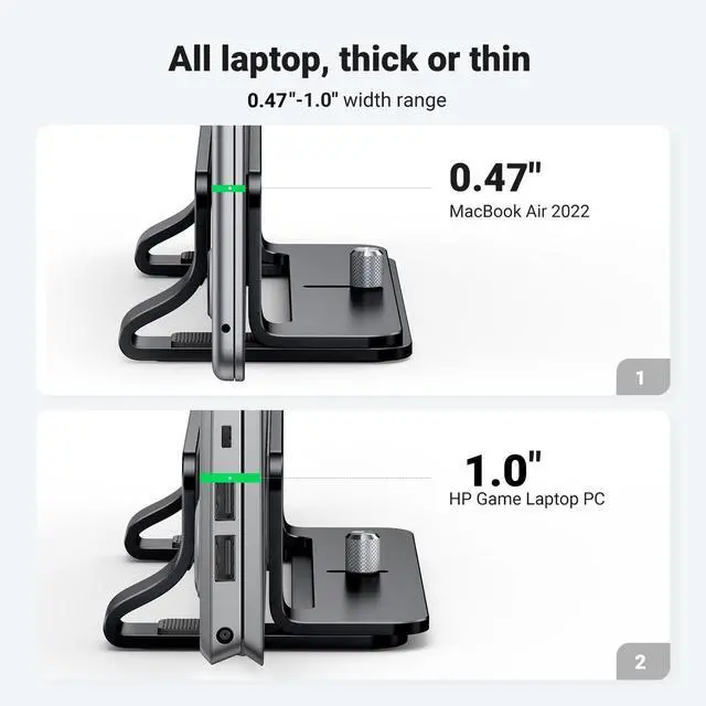 Adjustable Width: The laptop holder stand has extensible slot, which fits laptop with thickness from 0.47" to 1". Simply twist screw, the vertical laptop stand is compatible for MacBook Air, MacBook Pro, HP Notebook, Dell Chromebook, ThinkPad up to 17.3"