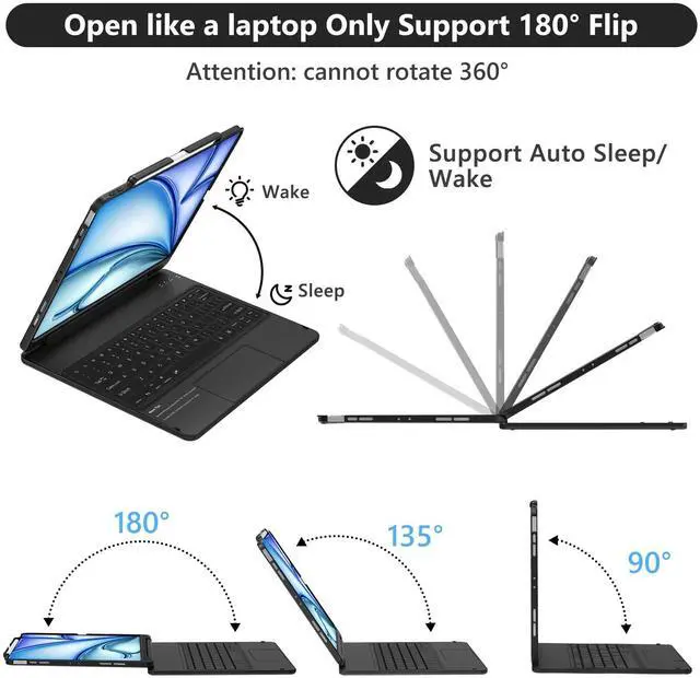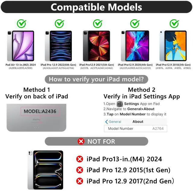 CompatibilityThe keyboard case is perfectly compatible with the latest iPad air 13 inch(M2) 2024 (A2898,A2899,A2900),For iPad air 13 inch(M3) 2025 (A3269, A3271),For iPad Pro 12.9 inch 6th Generation 2022 (A2436,A2764,A2437,A2766),For iPad Pro 12.9 inch 5th Generation 2021 (A2378,A2461,A2379,A2462),For iPad Pro 12.9 inch 4th Generation 2020 (A2229,A2069,A2232,A2233),For iPad Pro 12.9 inch 3rd Generation 2018 (A1876,A2014,A1895,A1983). Note:NOT fit for iPad Pro 13 inch (M4) 2024, iPad Pro 12.9 (2nd/1st Gen)